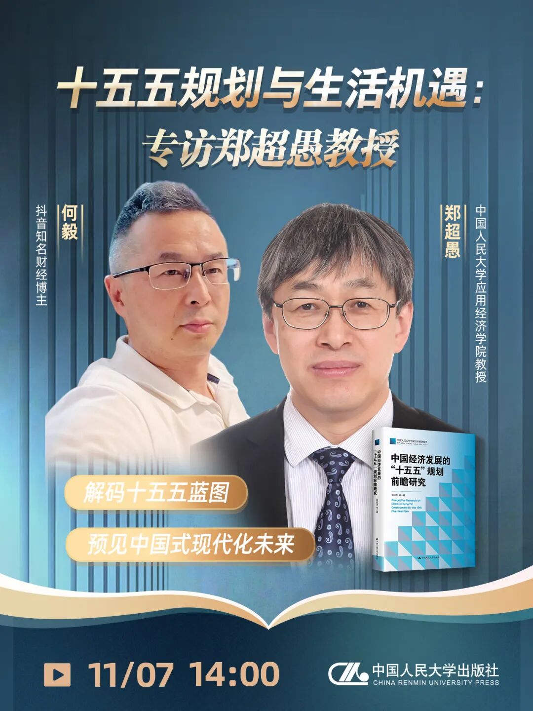 学术公告 当前位置: 首页 - 学术公告 - 讲座 专访郑超愚教授:解码“十五五”蓝图、预见中国式现代化未来——即将直播,欢迎观看! 发文时间: 2025-11-07 阅读次数: 欢迎您扫码观看直播! 直播时间 11月7日(星期五)14:00 来源:中国人民大学出版社 设计 责编:马文林 审核:陈佳莹 宋枫