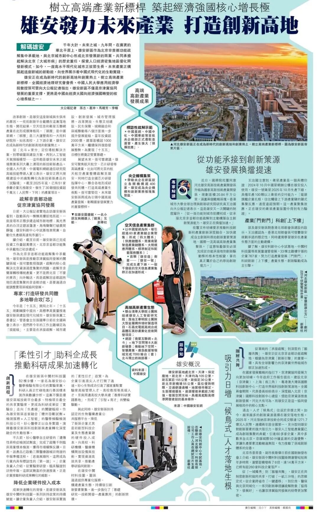 雄安正在成為新時代的創新高地和創業熱土,樹立高端產業新標桿。全國經濟地理研究會會長、中國人民大學應用經濟學院教授張可雲向大公報記者指出,雄安新區不僅是京津冀協同發展的重要支撐,更將是中國由經濟大國向經濟強國轉變的核心增長極之一。