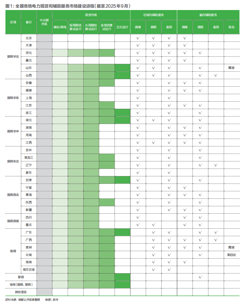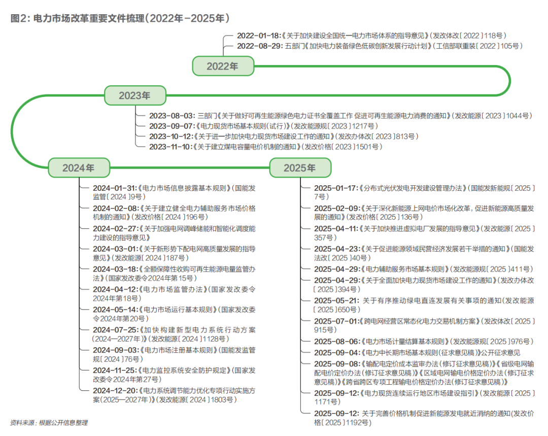 第二,以省为主体探索市场化改革路径,市场规则体系不断完善。本轮电力市场化改革呈现“省为主体、试点先行、逐步推进、统筹统一”的特点。中央负责顶层设计,地方结合资源结构、产业基础和负荷特征开展试点,各省市场建设呈现共性与差异并存的格局(见图1)。部分省份率先启动现货市场连续试运行,形成较为成熟的交易体系;部分地区则以中长期交易为主,配合局部现货试点推进。差异化的市场设计反映出各地在电源结构、水电季节性、负荷特征等方面的不同。2022年以来,国家能源局陆续出台市场准入、计量结算、信息披露三项基础性规则,以及中长期、现货、辅助服务三类交易规则,明确全国统一电力市场的总体目标(见图2)。