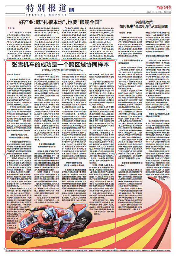 从湖南山村走出的修车少年,到WSBK世界冠军的缔造者,张雪机车的故事刷屏了整个春天。但喧嚣之下,一条覆盖东、中、西三地的产业协同链条正在悄然重塑中国区域经济合作的底层逻辑。中国人民大学应用经济学院教授、全国经济地理研究会会长张可云近日撰文指出,张雪机车是“一个东、中、西合作与区域联动发展的鲜活案例”。在专访中,他向记者深度剖析了“区域方法”的实践路径、制度障碍与未来方向。