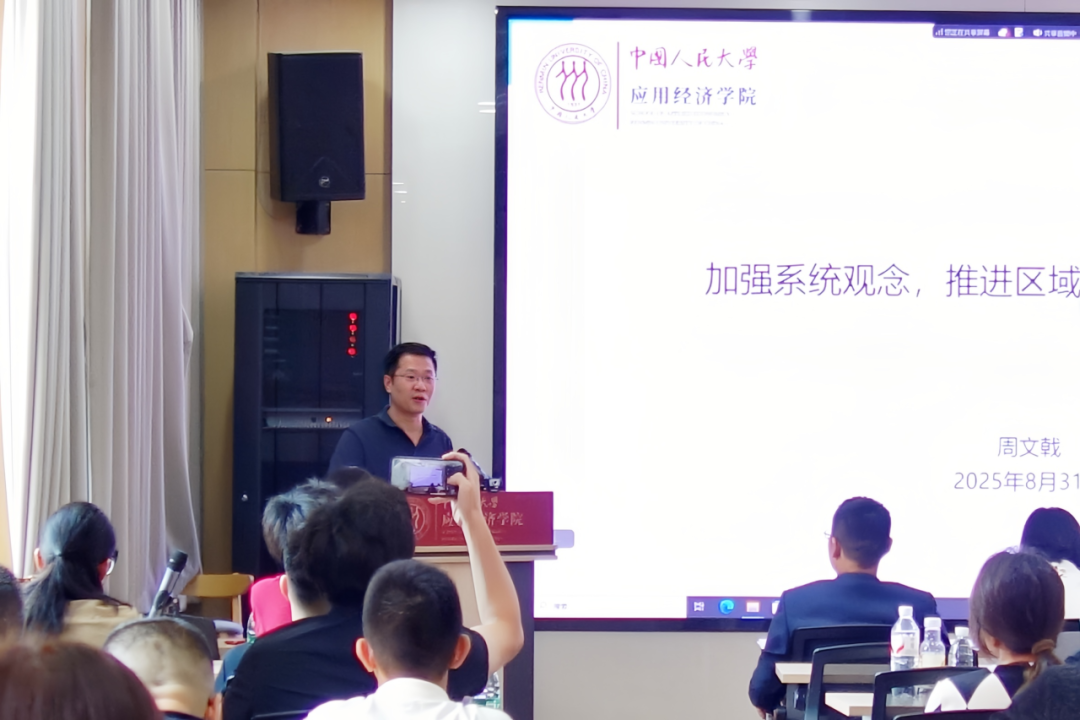 周文戟在“大师闪电课”环节带来《加强系统观念,推进区域协调绿色低碳转型》主题分享,生动阐述了"双碳"目标的系统性与区域性特征,指出各地在发展阶段、资源禀赋及排放现状上存在显著差异,并与现场参会同学积极互动。