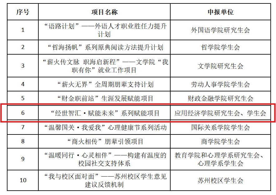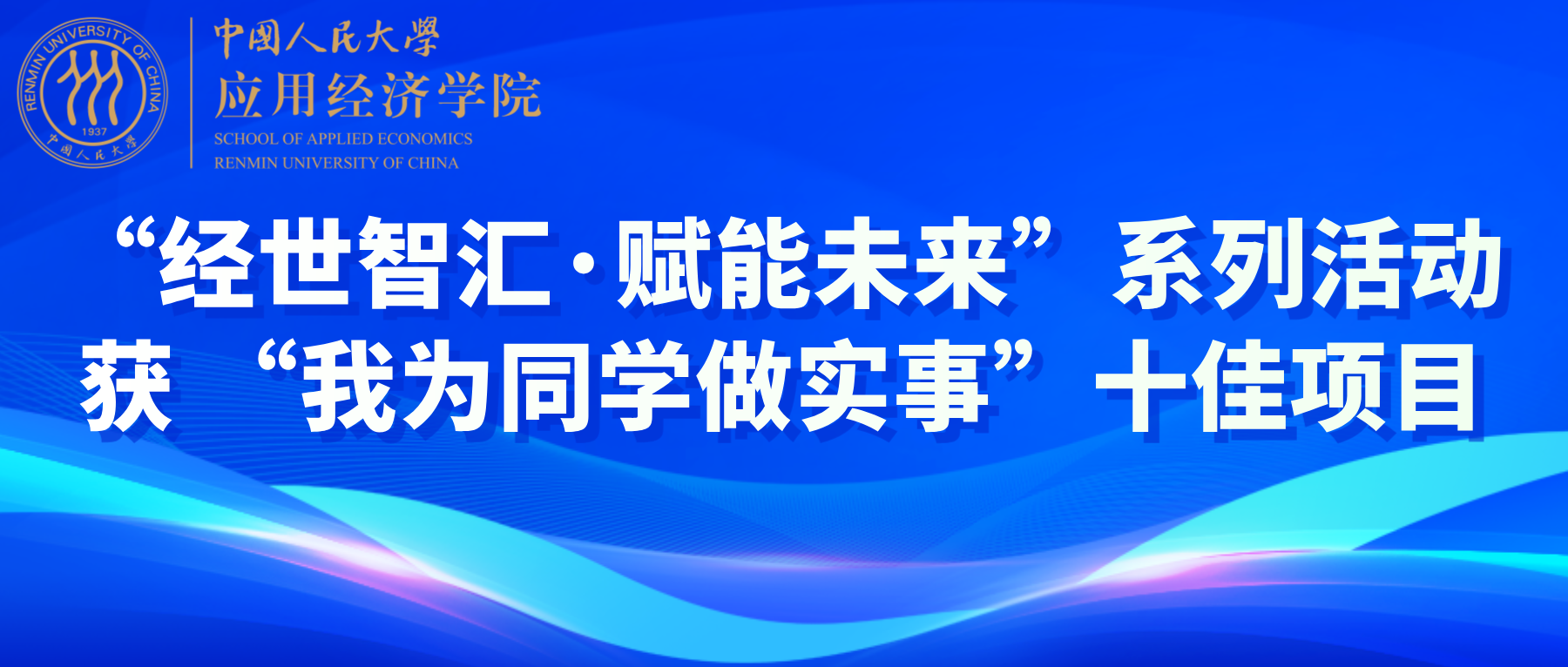 日前,在中国人民大学2024年度“我为同学做实事”院系学生会、研究生会十佳项目评选中,由应用经济学院研究生会、学生会联合申报的“经世智汇·赋能未来”系列赋能活动脱颖而出,再获十佳!自“我为同学做实事”评选两年来,学院学生系列活动已连续入选。