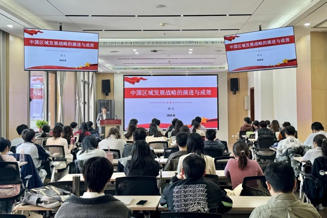 为深入学习贯彻党的二十届三中全会精神,全面学习贯彻全国教育大会精神,持续贯彻落实习近平总书记在中国人民大学考察调研时重要讲话精神,扎实落实学校第十五次党代会部署,近日,应用经济学院第十一期入党积极分子培训班第一讲暨“先锋闯将训练营”系列讲座举办。应用经济学院党委委员刘玉教授为学院师生党员代表、入党积极分子、形势与政策课学生等作“中国区域发展战略的演进与成效”主题讲座。