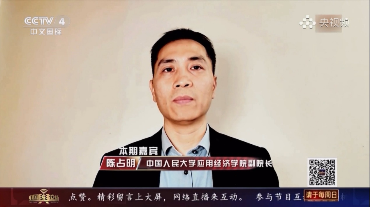 4月13日,中国人民大学应用经济学院陈占明教授接受中央广播电视总台《中国舆论场》等栏目采访并发表观点。
