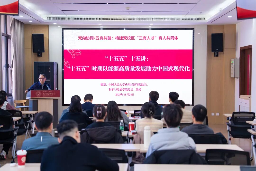为深入学习贯彻党的二十届四中全会精神,近日,应用经济学院院长、和平与发展学院院长魏楚教授在明德商学楼407会议室作题为《“十五五”时期以能源高质量发展助力中国式现代化》的“形势与政策”课专题讲座。活动由应用经济学院党委副书记、纪委书记孙浩爽主持。