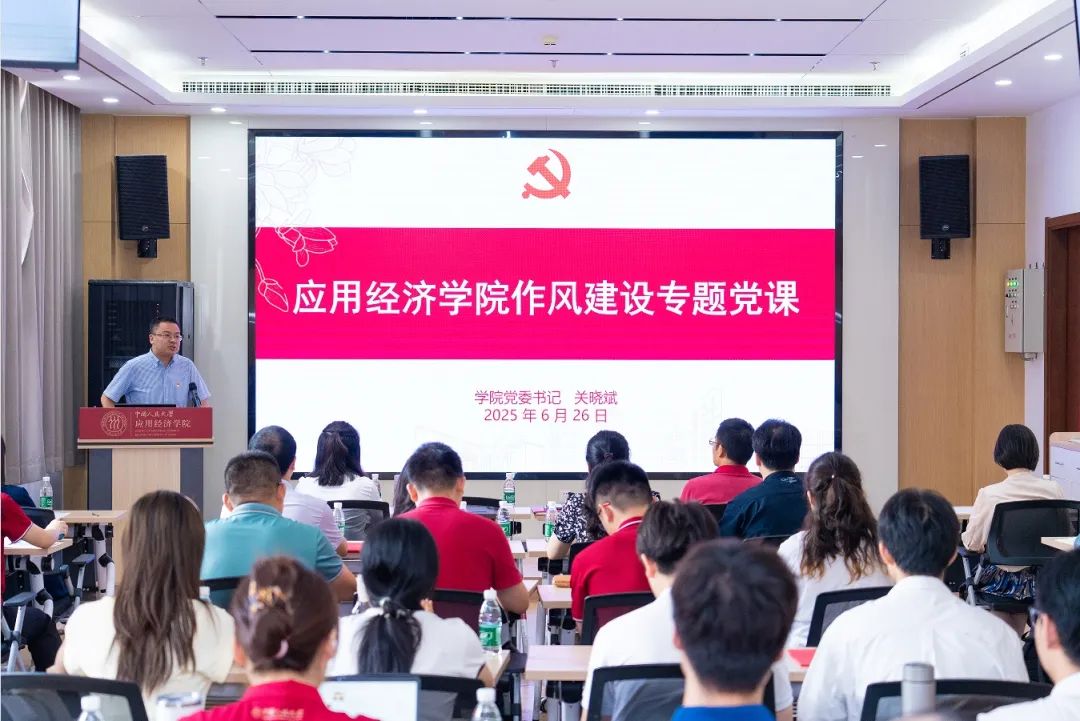 为扎实推进深入贯彻中央八项规定精神学习教育,学习领会习近平总书记关于加强党的作风建设的重要论述,持续推进作风建设常态化长效化,6月26日下午,应用经济学院党委书记关晓斌讲授作风建设专题党课,应用经济学院师生党支部书记、党员代表、2025年度新发展党员等参加学习。