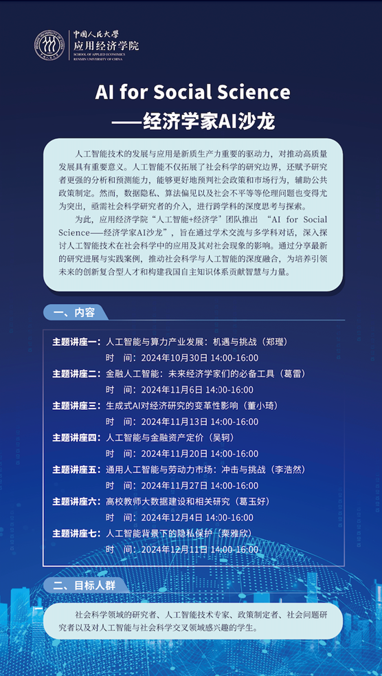 学院高度重视跨学科交流平台的建设,积极推动人工智能与社会科学的深度融合。2024年,学院举办了两场“AI for Social Science”论坛和九场“AI for Social Science”经济学家学术沙龙,邀请业界及不同学科领域的专家学者开展交流与对话。在这些活动中,不同学科的思维方式与研究方法相互碰撞,极大地激发了学术创新的活力。