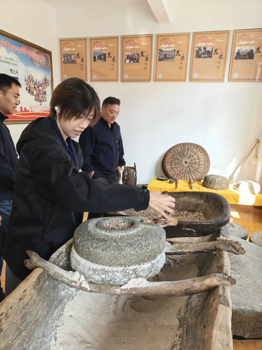 ▲北京大学经济学院博士后蔡宇涵体验手工磨青稞