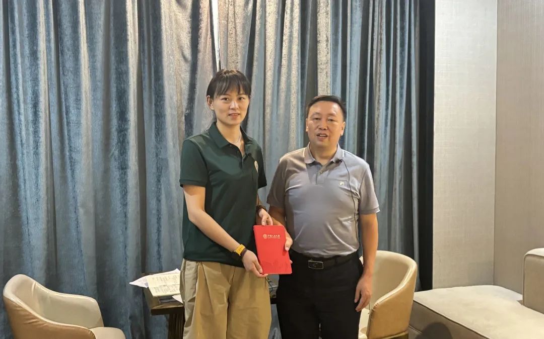 ▲经济与贸易学院硕士生赵怿玮对锦滨镇党委书记张军访谈后赠书留念