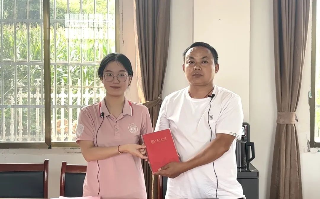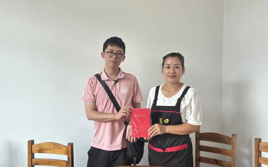 ▲经济与贸易学院硕士生杨芷婕对长坡新村村支书村魏果访谈后赠书留念