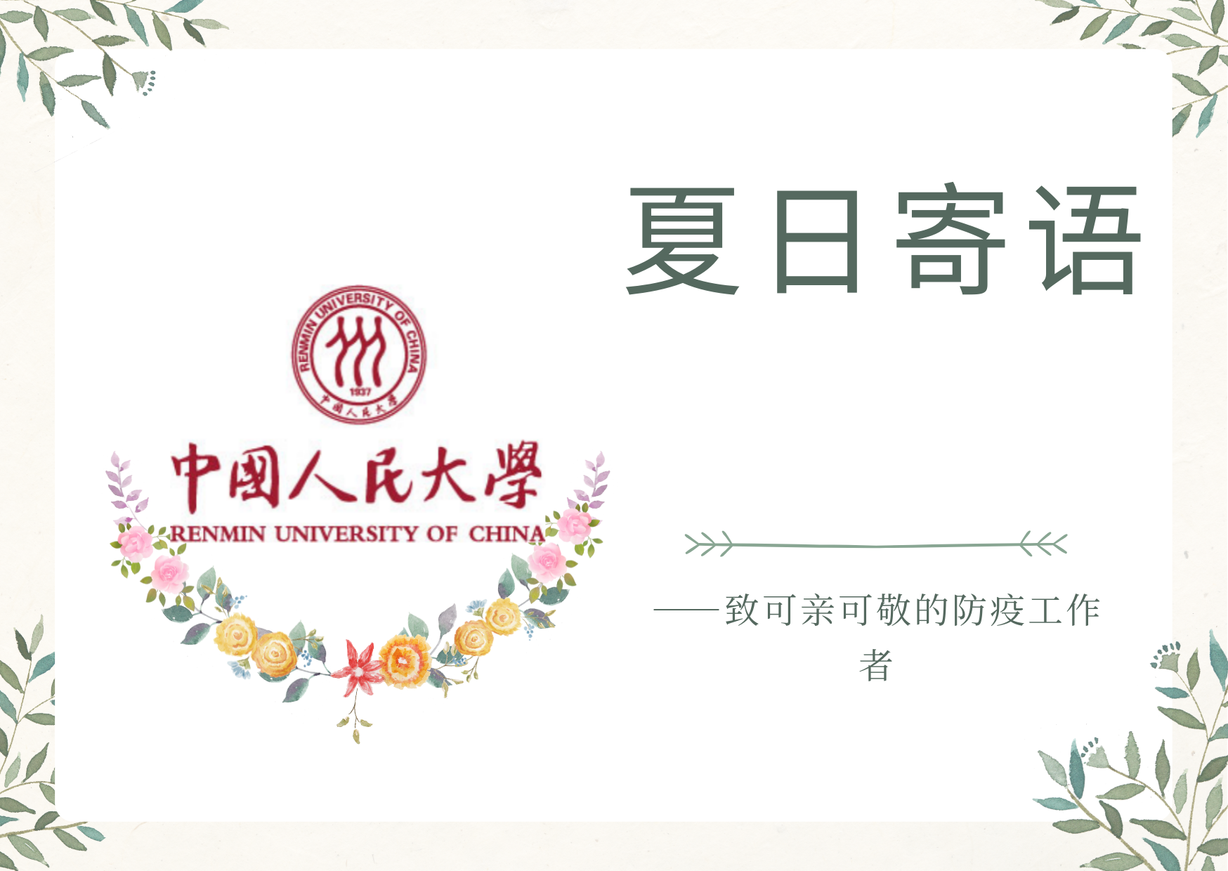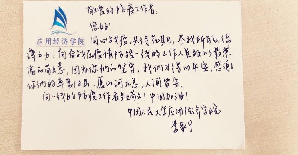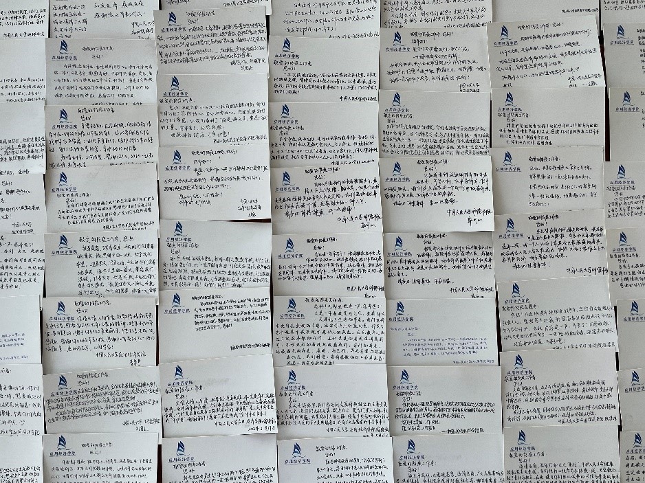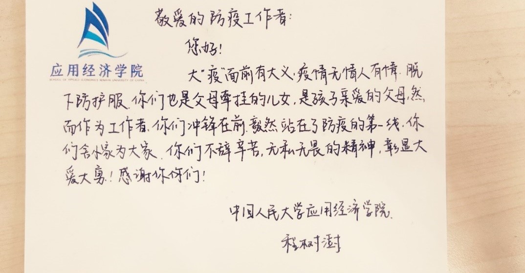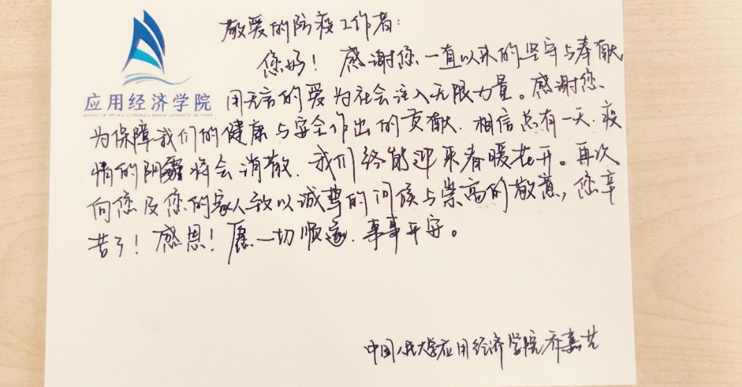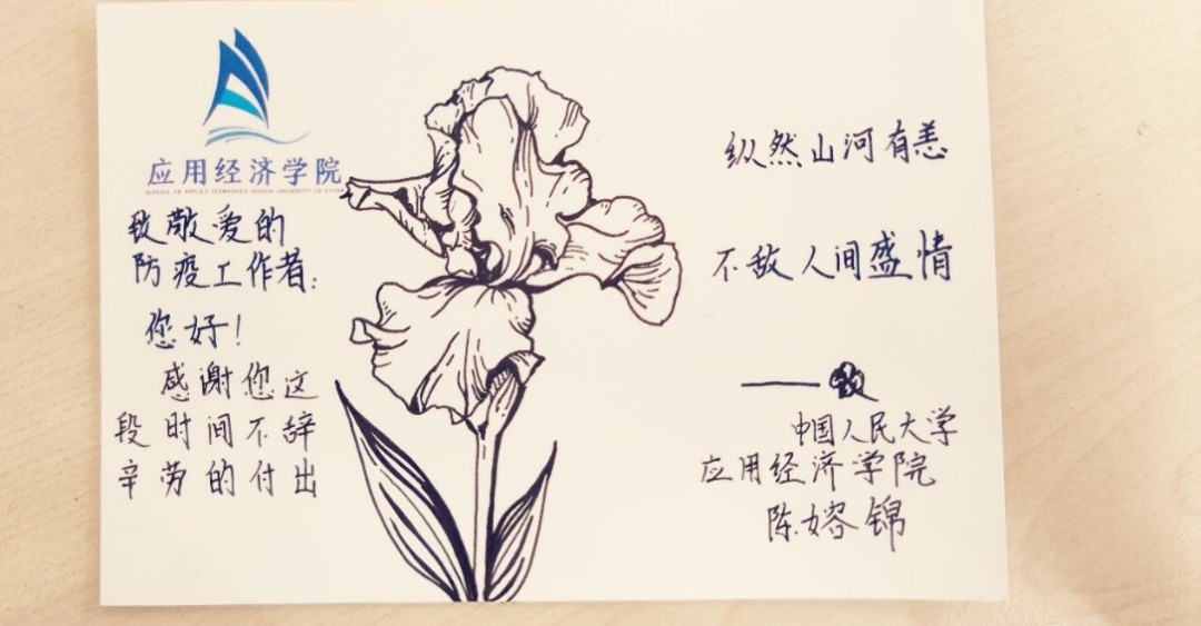 在志愿者的积极参与下,本次“信好有你,健康同行”圆满结束。本次活动得到了来自全校多个学院同学的积极响应,共有不同学院的65名同学以及6名工作人员参与,收集了三百余张明信片。所有明信片经工作人员整理后赠送给了人民大学校内医护人员和防疫志愿者。与此同时,同学们的明信片也受到了各位防疫工作者的感激与认可。致谢者与防疫者相互温暖,融融情谊共迎盛夏。