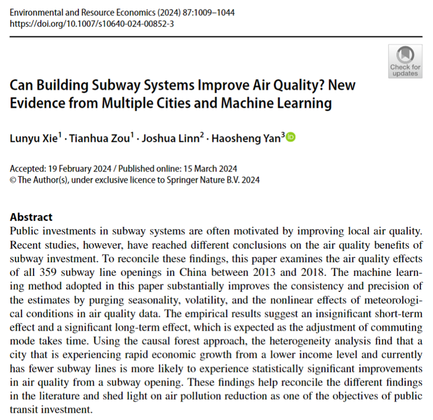 近日,中国人民大学应用经济学院谢伦裕教授团队的研究成果“Can Building Subway Systems Improve Air Quality? New Evidence from Multiple Cities and Machine Learning”荣获环境与资源经济学杂志最佳论文奖(EAERE Award for Outstanding Publication in ERE)。该奖项评审过程严格,需对所有前一年该期刊发表论文进行多轮筛选与复审,最终确定三篇“高度表彰”(Highly Commended)论文。