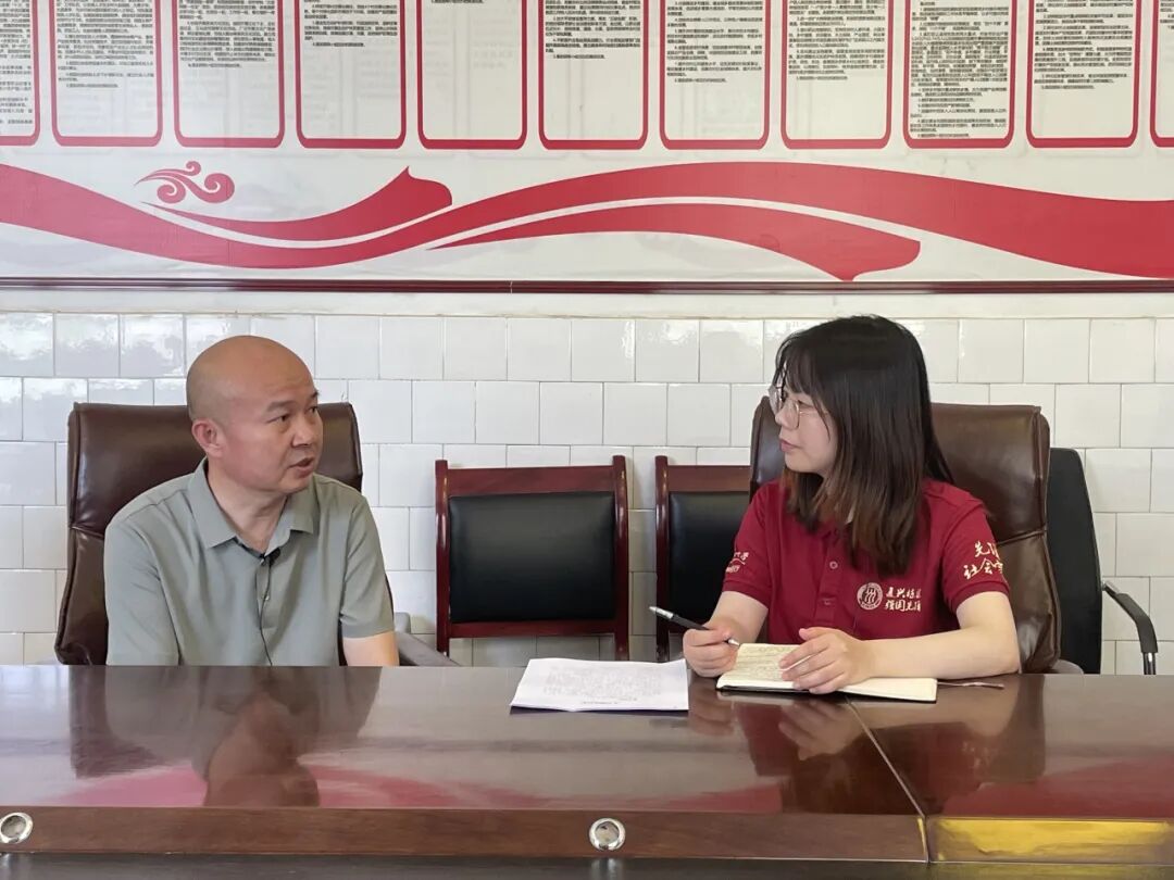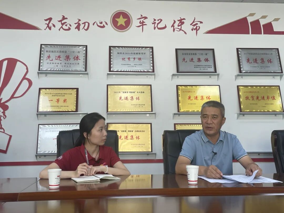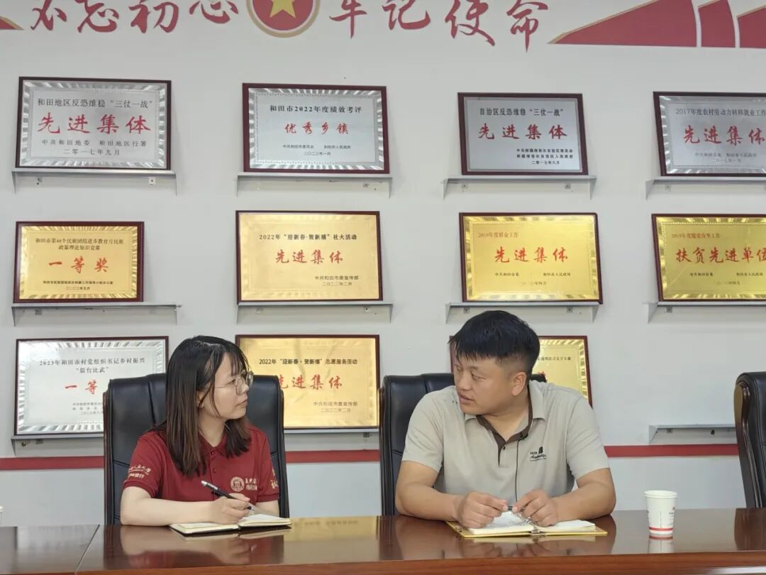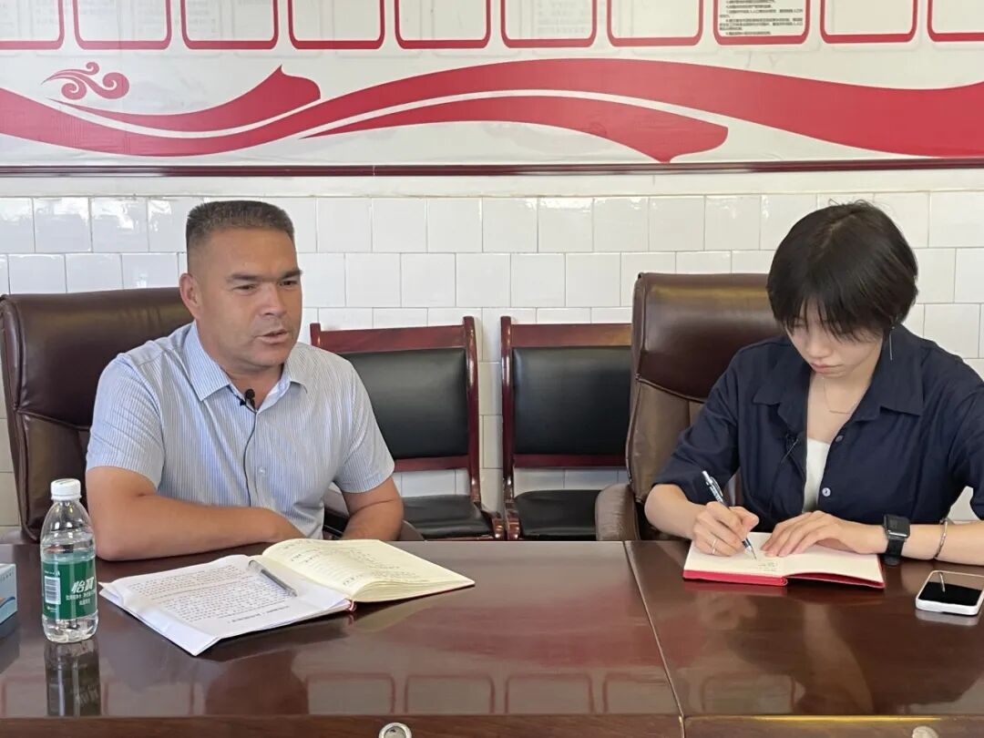 ▲中国人民大学应用经济学院硕士生黄欣欣访谈和田市拉斯奎镇党委书记、党校校长姚德峰