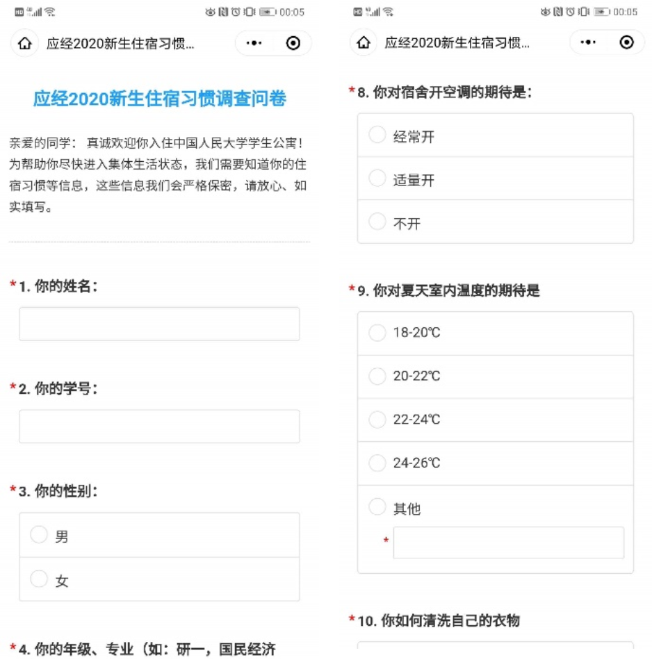宿舍是新生生活的最小单元。在学校住宿调查的基础上,学院精心制作了包含14个问题的调查问卷,涉及基础信息、睡眠习惯、特殊偏好、寝室定位、人际期待等内容,全方位了解同学们的个性化需求,力求为同学们绘制精准住宿自画像。根据新生调查结果分配宿舍和床位,获得学生和家长的认可和赞许。