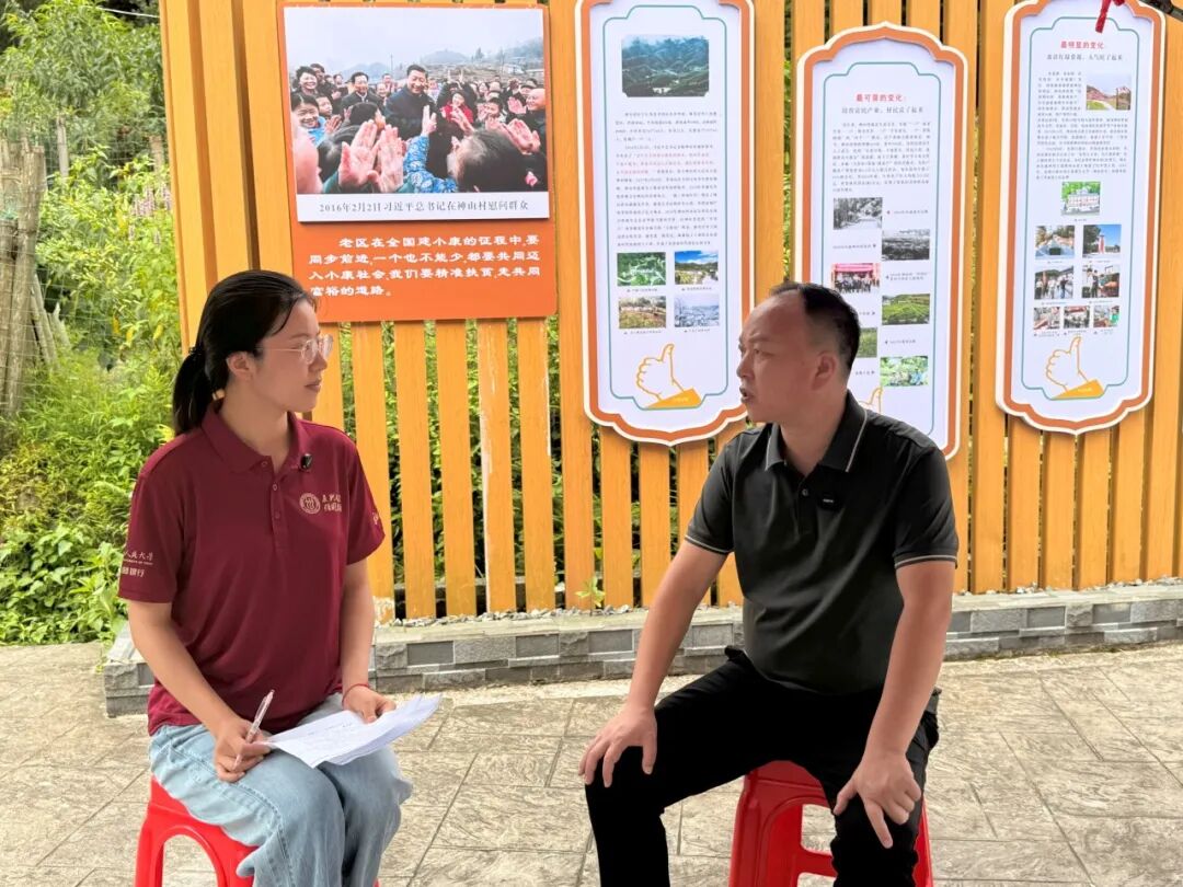 ▲中国人民大学应用经济学硕士生李昕玥访谈茅坪镇副镇长兼任神山村支部书记彭展阳