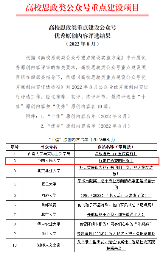 高校思政网日前公布了高校思政类重点建设公众号优秀原创内容2022年第三季度评选结果,中国人民大学新媒体作品《行走在希望的田野上》获2022年8月“十佳”原创内容。