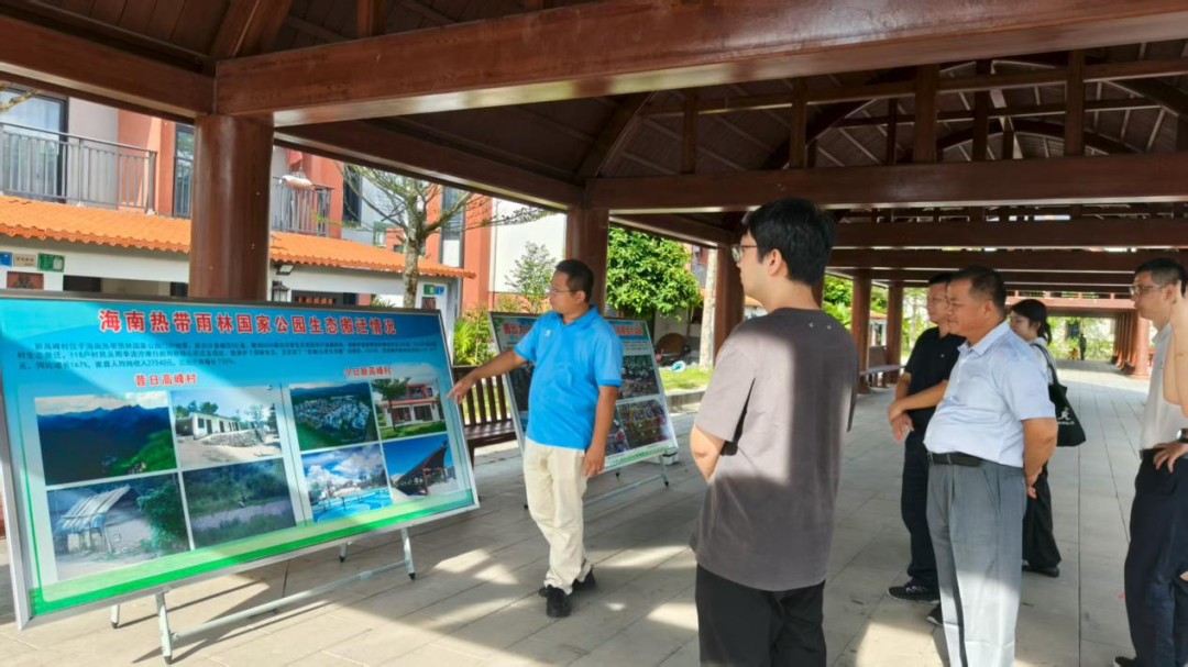 8月20日下午,调研团到访白沙县牙叉镇新高峰村,访谈村党支部书记符志明,调研易地扶贫搬迁。新高峰村位于海南热带雨林国家公园门户地带,毗邻5000亩白沙原生态茶园和万亩橡胶林。原高峰村坐落于鹦哥岭腹地,2020年为保护雨林生态以及发展产业,高峰村整村生态搬迁,从雨林核心区迁至现址。