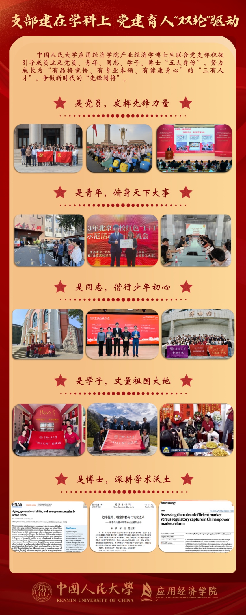 研究生党建“双创”工作是新时代高校党建示范创建和质量创优的重要抓手,是提升研究生思想政治工作质量的关键引擎。应用经济学院产业经济学博士生联合党支部充分发挥样板引领、辐射带动作用,把成熟的党建经验转化为可复制、可推广的制度成果,为全国高校研究生党建工作提供更多“人大方案”。让我们以先进为榜样,在青春的赛道上奋力奔跑,争做堪当民族复兴重任的时代新人,共同书写人大学子奋进新征程、建功新时代的壮丽青春华章!