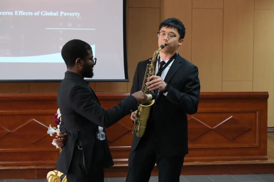 会议中场,应用经济学院博士生陈芷琪表演中国古典舞《月光梨影》,杨杰演奏萨克斯曲《月亮代表我的心》,文化交流进一步深化了中安青年的友谊。