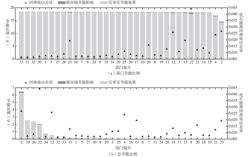 注:子图(a)中的节能比例为各部门化石能源利用效率提升15%所引起的实际节能量占部门自身化石能耗的比重;子图(b)中的节能比例为相同情境下实际节能量占生产侧总化石能耗的比重,反映部门绝对节能水平和节能贡献。