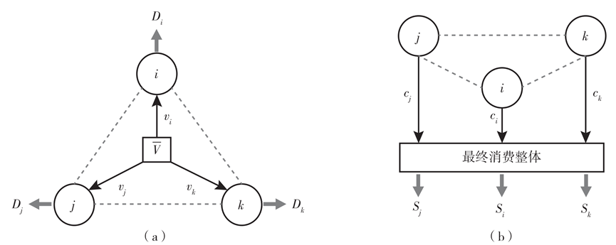 注:为便于理解与图示,示意图中假设经济仅包含 i、j、k 三个生产部门,虚线连接代表部门间的投入产出关联。子图(a)中,从初始投入要素()指向各部门的实线反映生产部门对初始投入要素的直接需求。子图(b)中,从各部门指向最终消费整体的实线反映代表性家庭对各部门产品的直接消费需求。