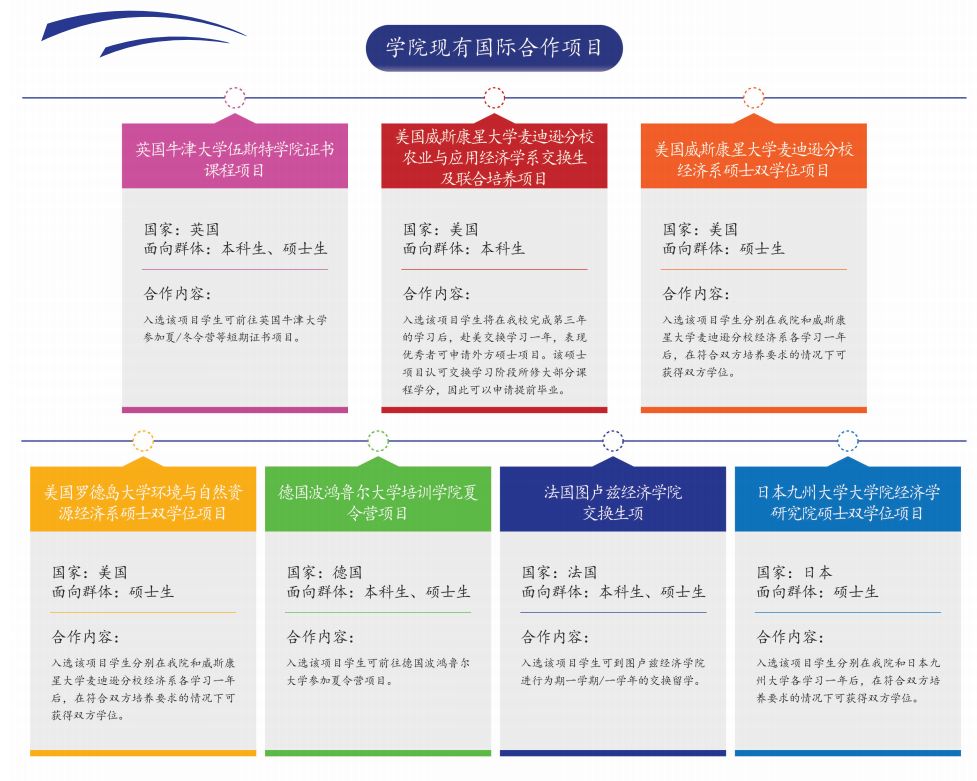 学院与多个国家和地区的知名学府与国际机构建立了紧密的合作关系。多位教师参加人类减贫经验国际论坛、中法全球治理论坛、联合国政策对话系列会议等重要国际论坛与会议,接受国际主流媒体专访。学院承办国家部委交办的援外项目、援外培训等,承接中国驻安哥拉大使馆邀请赴安哥拉开展学术交流及高级领导干部授课任务,举办“人与社会全面发展目标研讨会”“中国可持续发展年会”“应用宏观经济年度论坛”等品牌国际会议,邀请意大利前总理、欧盟委员会前主席罗马诺·普罗迪等作主旨演讲,开展“海峡两岸财经前沿问题论坛”,发挥专业优势,传播中国经验,讲好中国故事,致力于让世界更好地读懂中国。