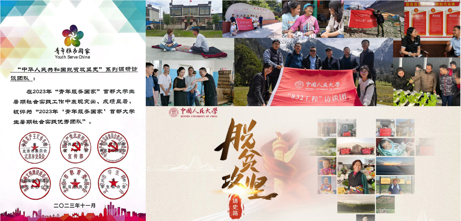 截止2025年7月,调研团队已经完成17个省份自治区371个原国家级贫困县的调研,完成《中华人民共和国脱贫攻坚史系列访谈丛书》之河南卷、安徽卷。项目成果获求是网、央视新闻等众多主流媒体报告,中宣部、中联部对该项目表示高度关注和支持,协调团队成员赴海外进行宣讲,介绍脱贫的中国经验、中国模式。项目教师团队获2024年北京高校优秀本科育人团队,中国人民大学2022年度师德优秀集体。“832工程”成功入选2025年教育部“新时代伟大变革融入高校思想政治教育典型案例”,成为全国高校思政教育的示范标杆。同时,项目学生团队荣获中国人民大学“先锋奖章”,连续多年获得“青年服务国家”首都大学生社会实践优秀团队。“脱贫攻坚铸史路”主题网页在北京高校思想政治理论课资源平台-实践育人板块上线。